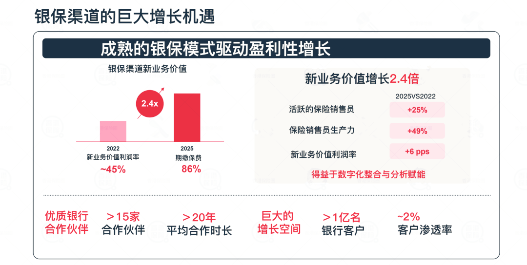 银保渠道成为新的增长极,与 2022 年相比实现跨越式发展:新业务价值同比暴涨 2.4 倍,利润率提升 6%-45%,活跃保险销售员增长 25%,生产力提升 49%。