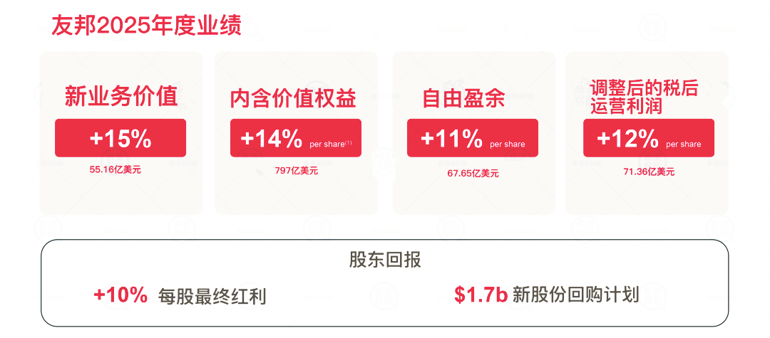 亮眼业绩直接惠及股东,2025 年友邦全年股息增至 193.08 港仙(约 1.93 港元 / 每股),同比增长10%,同时推出 17 亿美元股份回购计划,持续回馈投资者信任