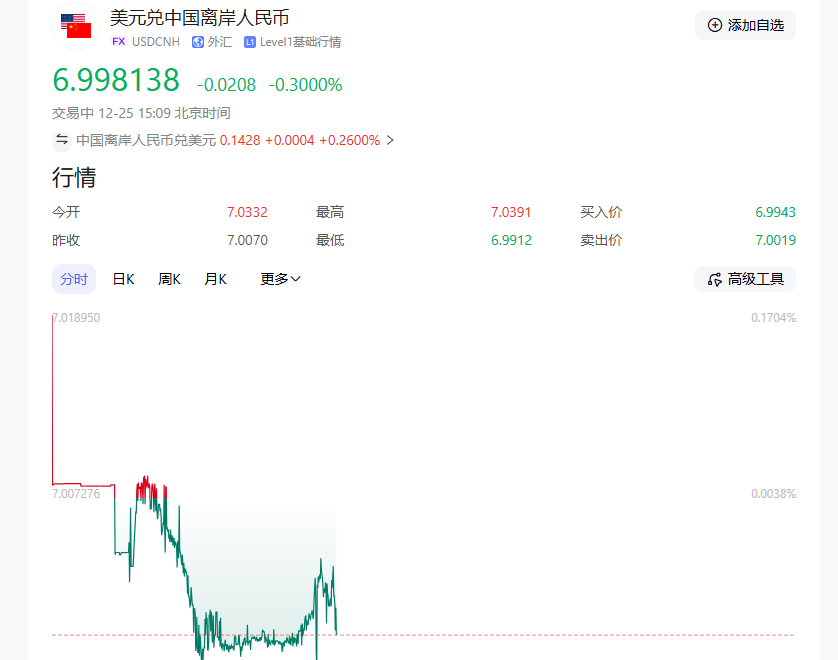 12月25日,离岸市场人民币汇率持续走强,升破7.0大关,最低报 6.9912,重新回到“6”字头。