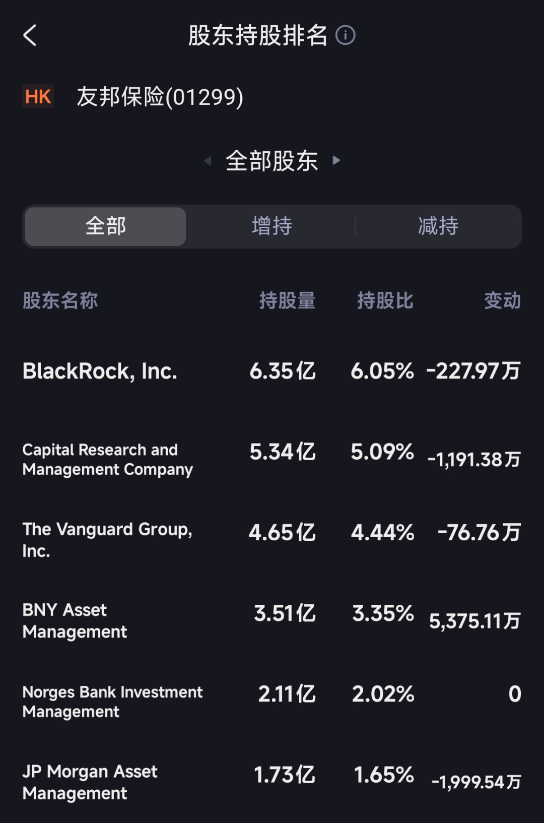 贝莱德集团、美国资本集团、先锋领航集团、纽约梅隆银行、摩根大通、挪威银行投资管理。全球顶级投资机构保驾护航,为友邦发展现状及前景,投下信心一票。