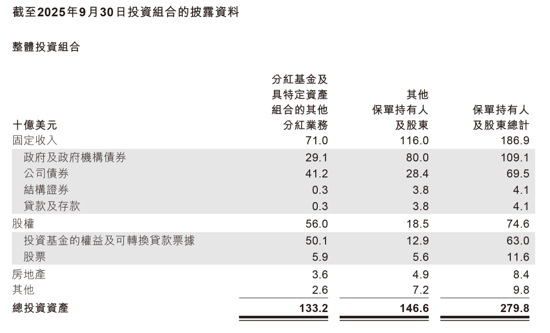 4.总投资2,798亿美元,中国业务80%为固定资产!截至2025年9月30日,友邦保险集团总投资资产高达2,798亿美元(未含单位连结式合约及合并投资基金总计),其中固定资产合计高达1,869亿美元,占总数67%!其中政府及企业债券分别占总固定资产的58%及37%,占固定资产96%