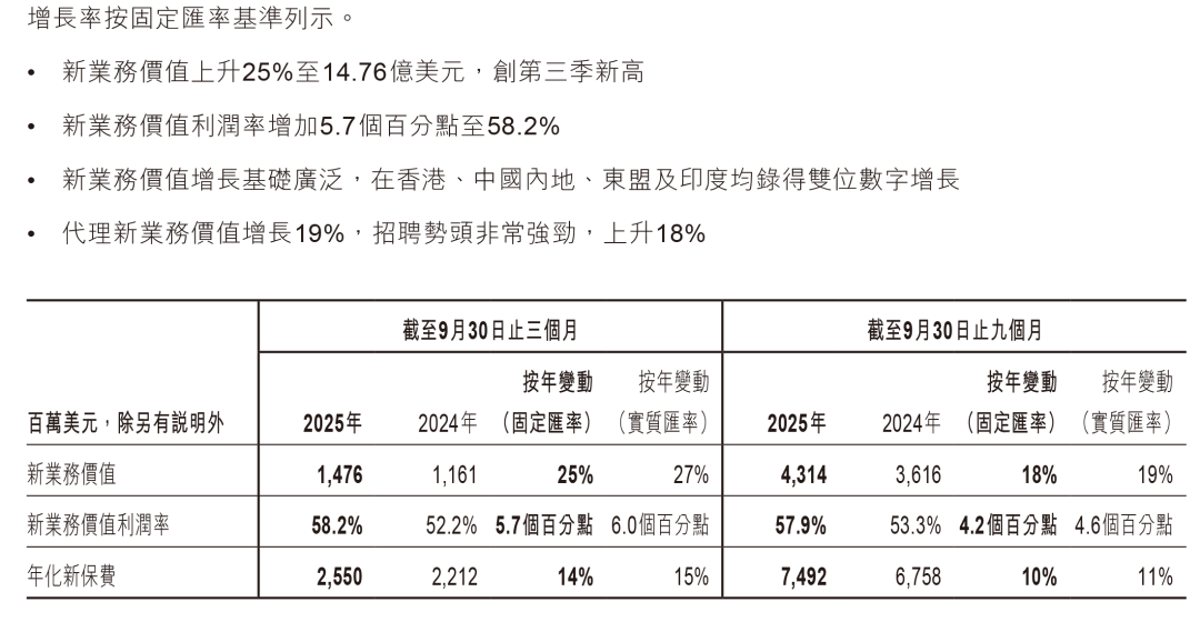 根据友邦保险公布的2025年第三季度业绩摘要,新业务价值同比增长25%至14.76亿美元,年化保费提升14%至25.5亿美元,再创业绩新高!